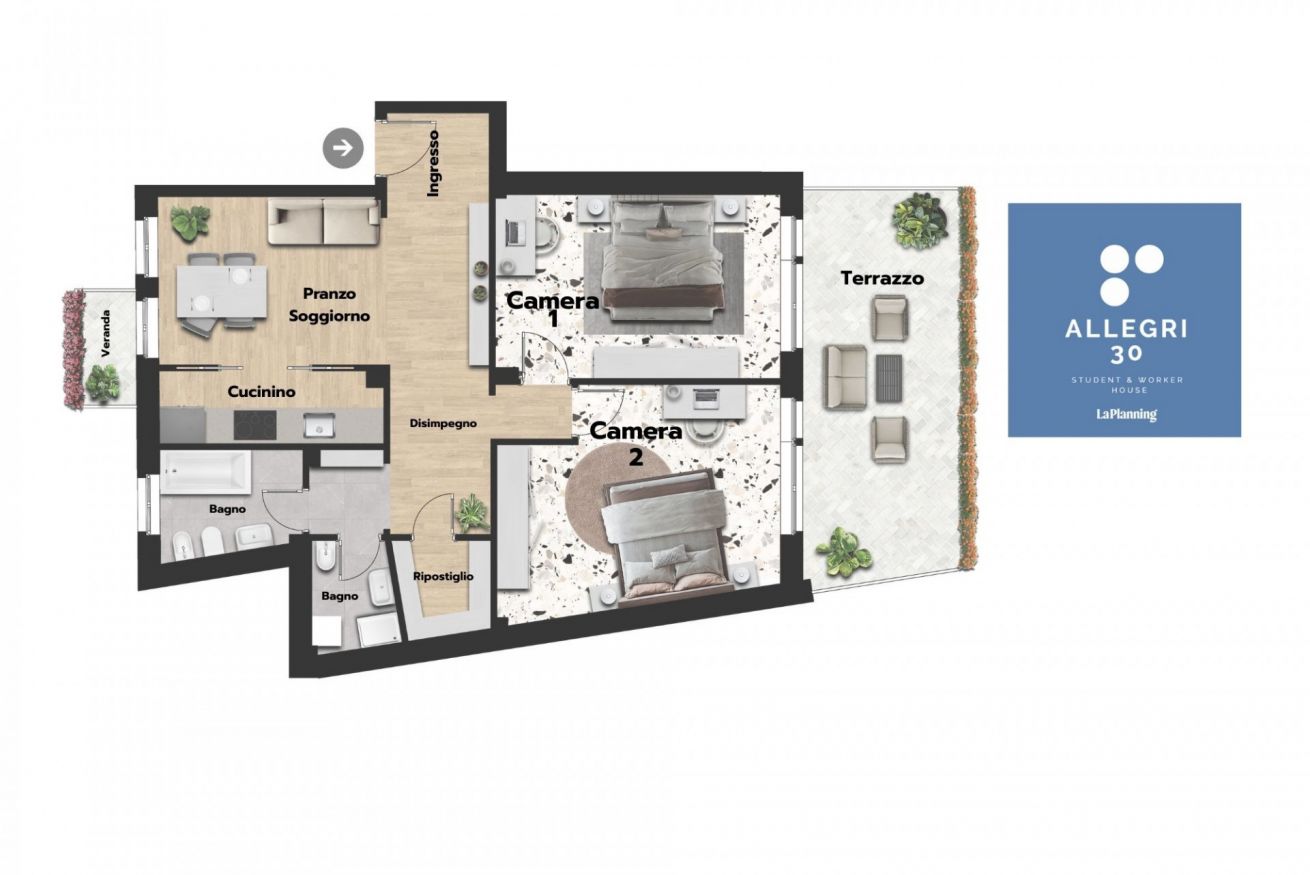 Camera Privata dotata di letto matrimoniale (uso singola) completo di materasso e guanciali, armadio, comodino, scrivania e sedia per lo studio inserita in alloggio con sole 2 camere private e con le seguenti aree condivise: Soggiorno con cucinino, ripostiglio, ampio terrazzo e 2 bagni.