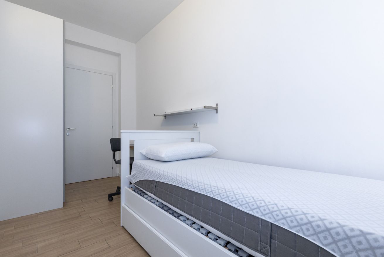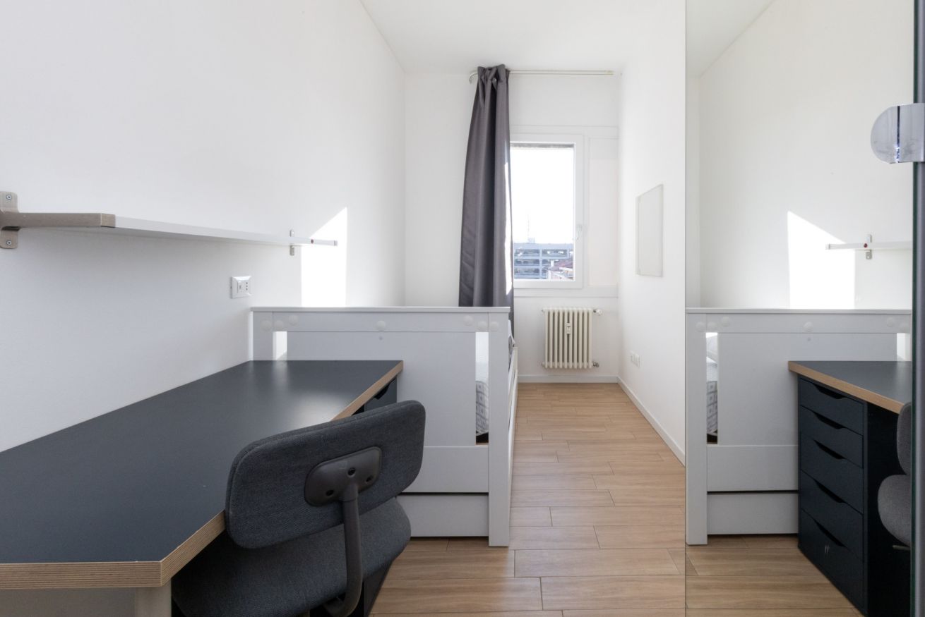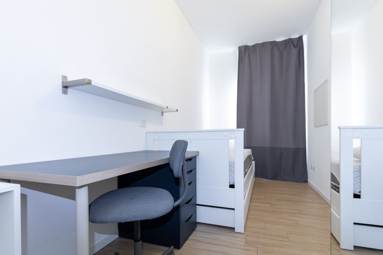 Camera Privata dotata di letto singolo (uso singola) completo di materasso e guanciale, armadio, comodino, scrivania e sedia per lo studio inserita in alloggio con altre 3 camere private e con le seguenti aree condivise: Soggiorno con angolo cottura, ripostiglio, terrazzino e 2 bagno.
