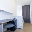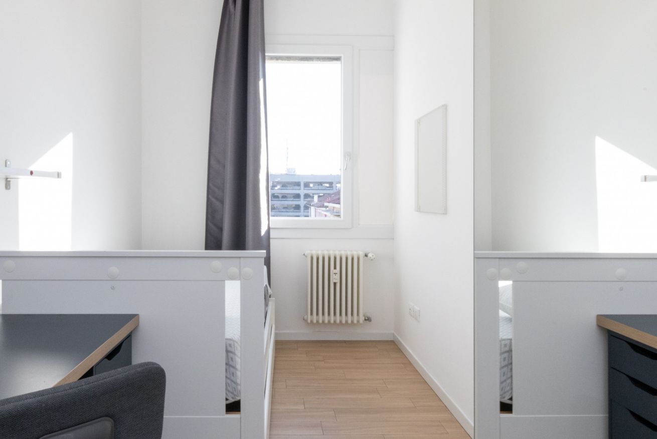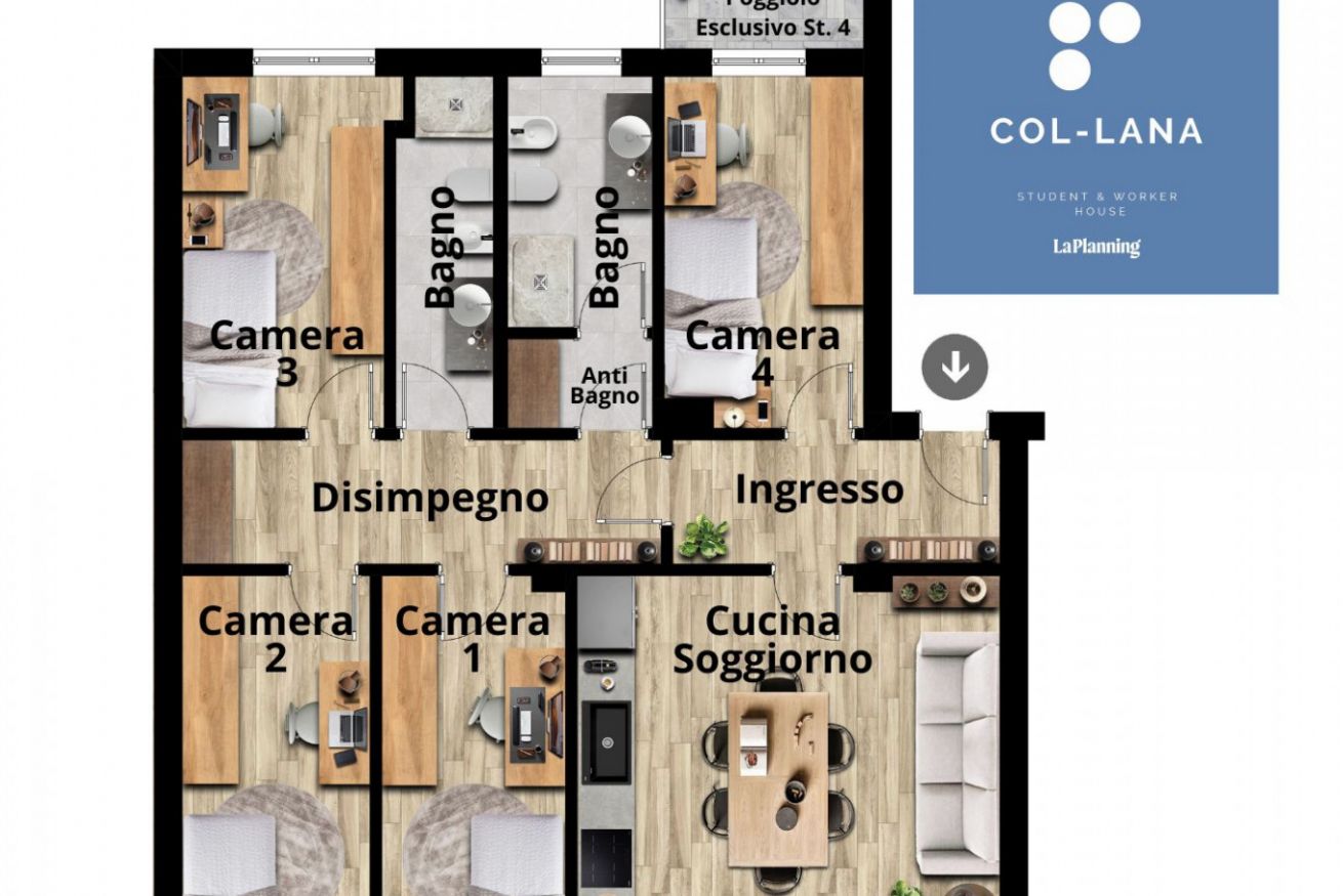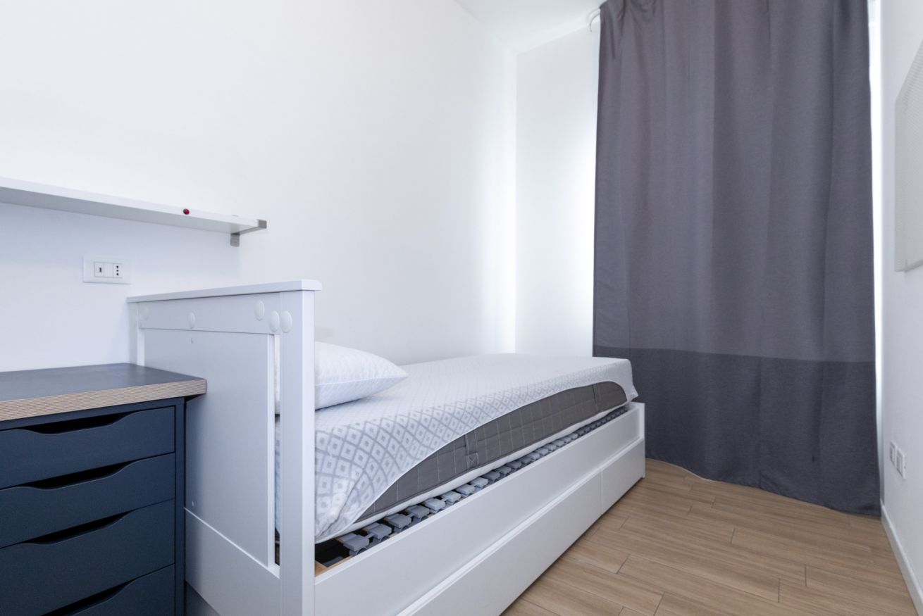 Camera Privata dotata di letto singolo (uso singola) completo di materasso e guanciale, armadio, comodino, scrivania e sedia per lo studio inserita in alloggio con altre 3 camere private e con le seguenti aree condivise: Soggiorno con angolo cottura, ripostiglio, terrazzino e 2 bagno.