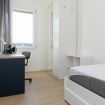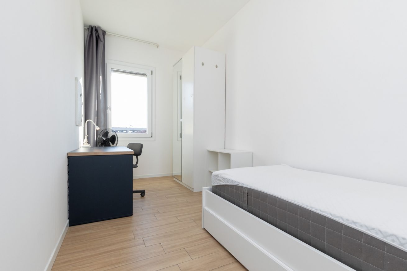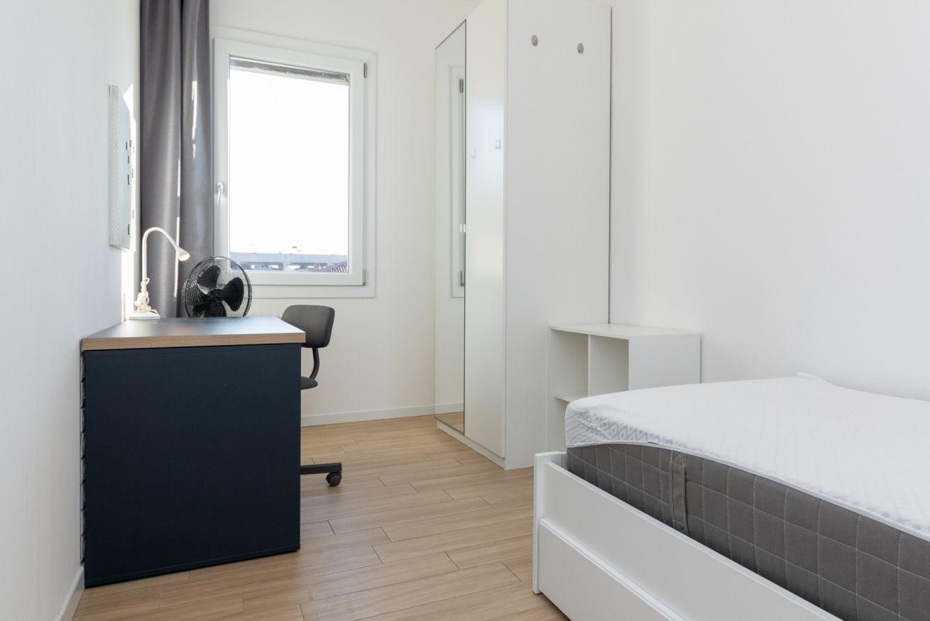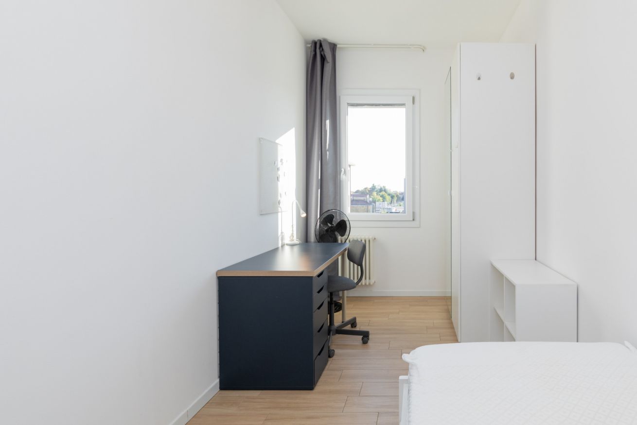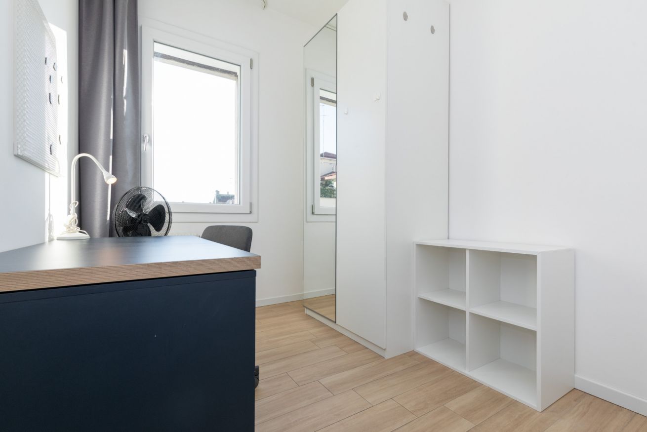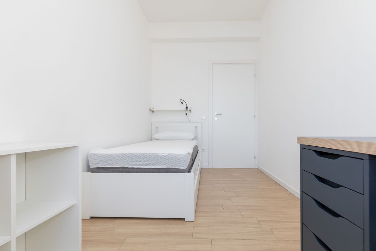 Camera Privata dotata di letto singolo (uso singola) completo di materasso e guanciale, armadio, comodino, scrivania e sedia per lo studio inserita in alloggio con altre 3 camere private e con le seguenti aree condivise: Soggiorno con angolo cottura, ripostiglio, terrazzino e 2 bagno.