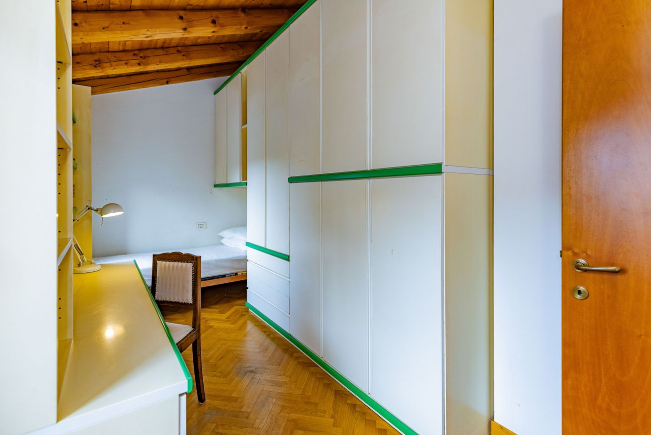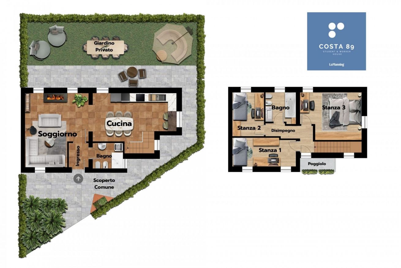 Camera singolo standard con letto singolo, armadio, scrivania e poltrona, inserita in porzione di villetta con 3 camere, scoperto e giardino esclusivo e con le seguenti aree condivise: al piano terra, ingresso con bagno finestrato (doccia+lavatrice), ampio soggiorno con cucina a vista - Al piano 1, disimpegno, 3 camere, bagno, poggiolo.