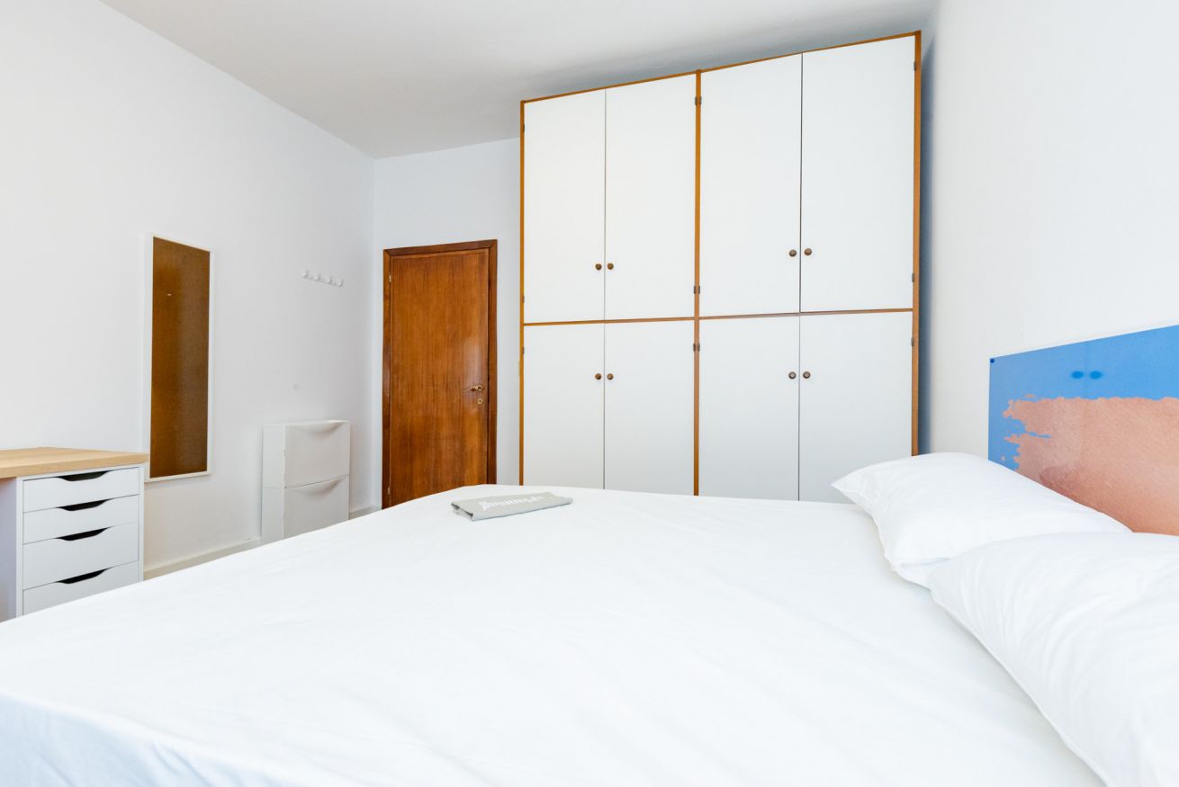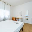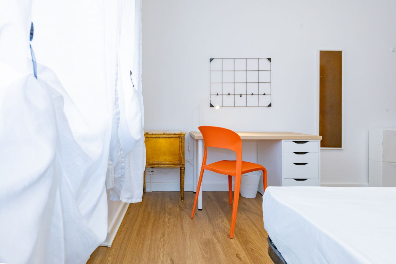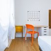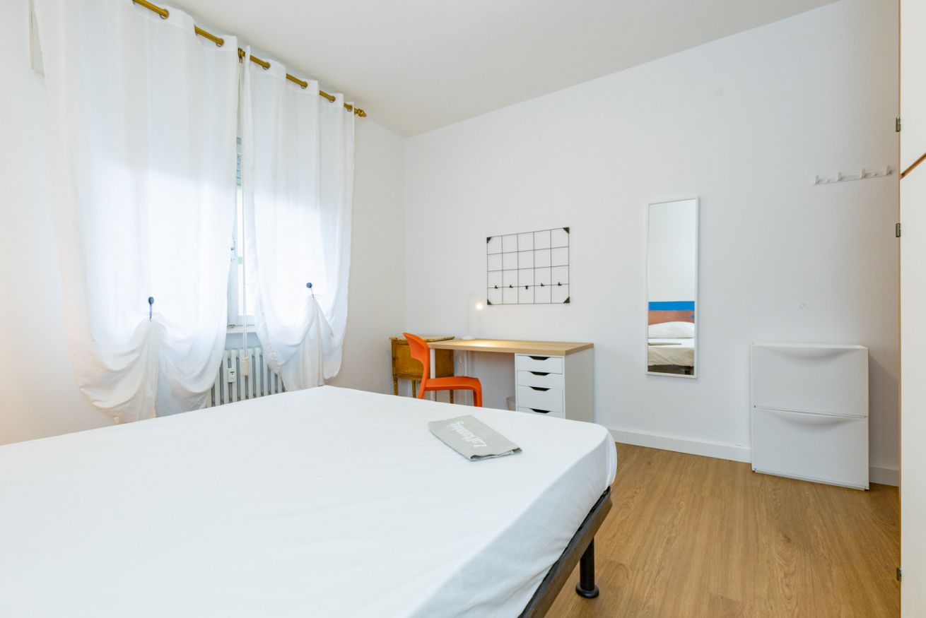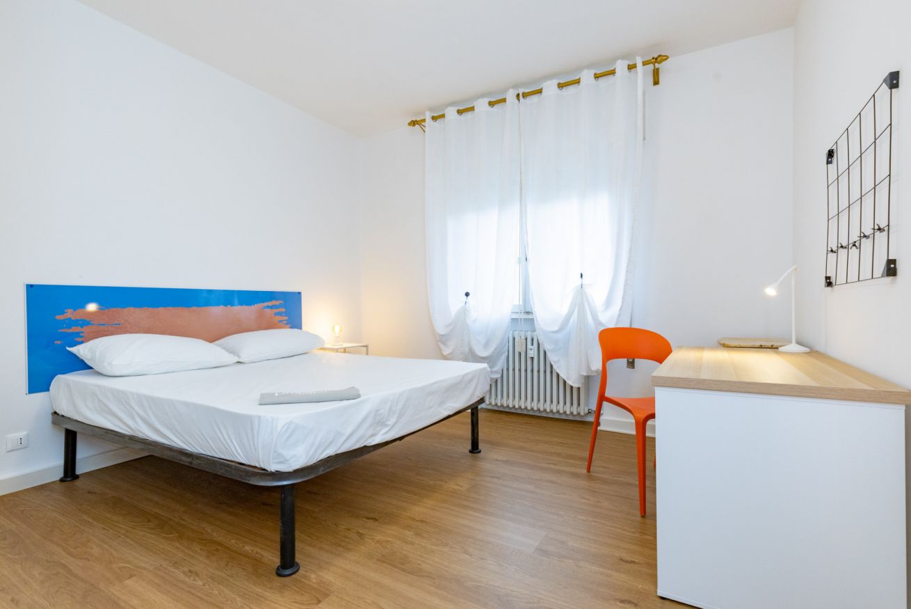 Camera Privata ad uso singolo con 2 letti accostati, comodini ed abajours, armadio doppio, comò, scrivania e lampada, specchio, attaccapanni, cestino e cesto portabiancheria. Inserita in alloggio con altre 3 camere private e con le seguenti aree condivise: ingresso, cucina e 1 bagno.