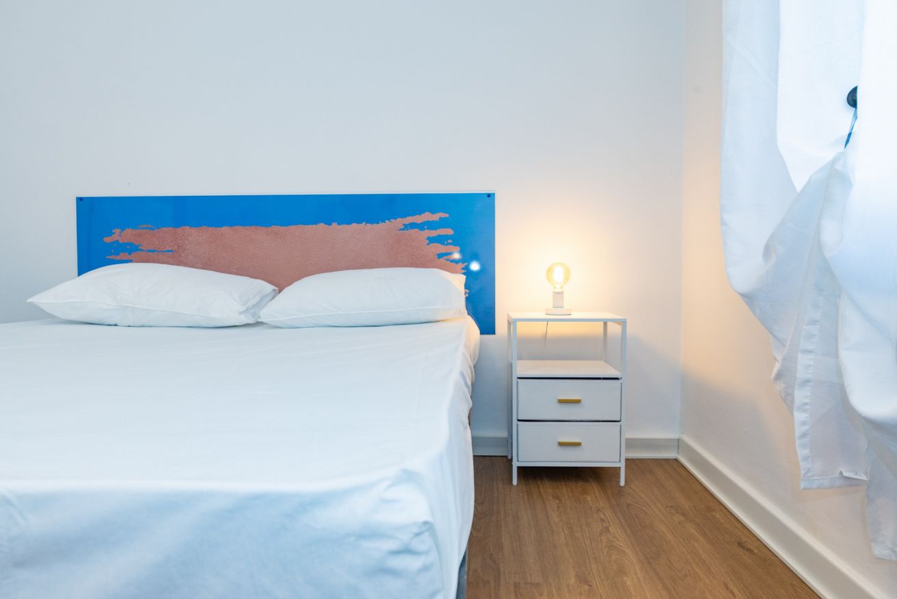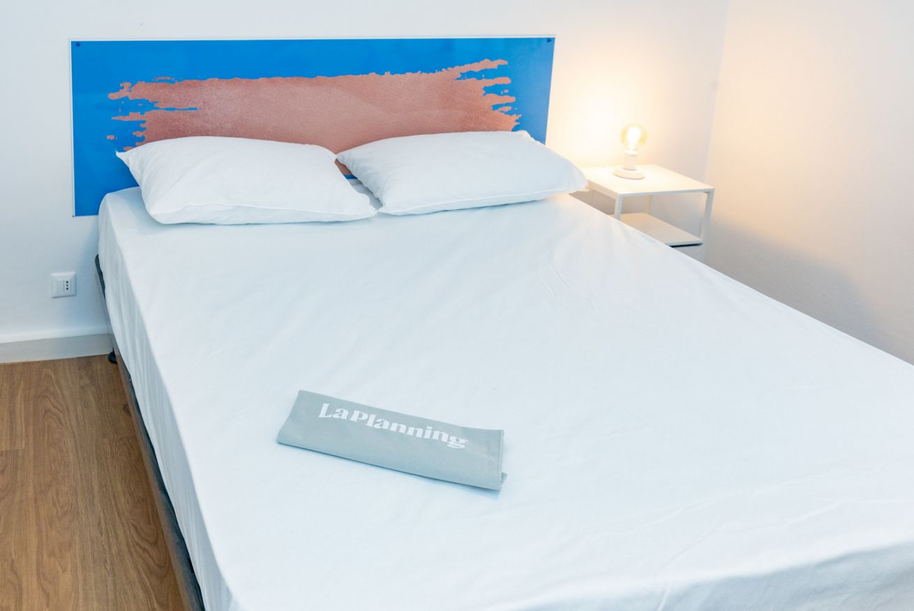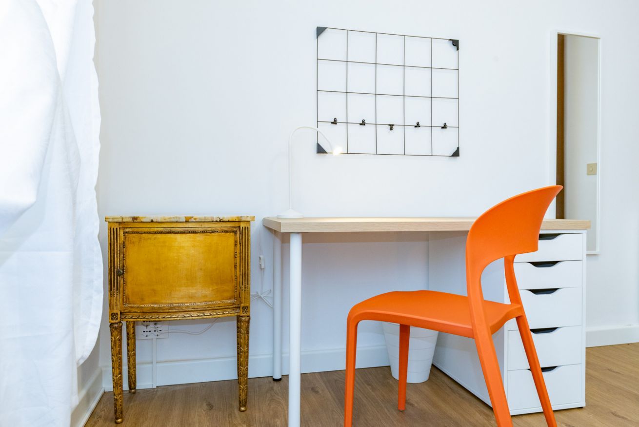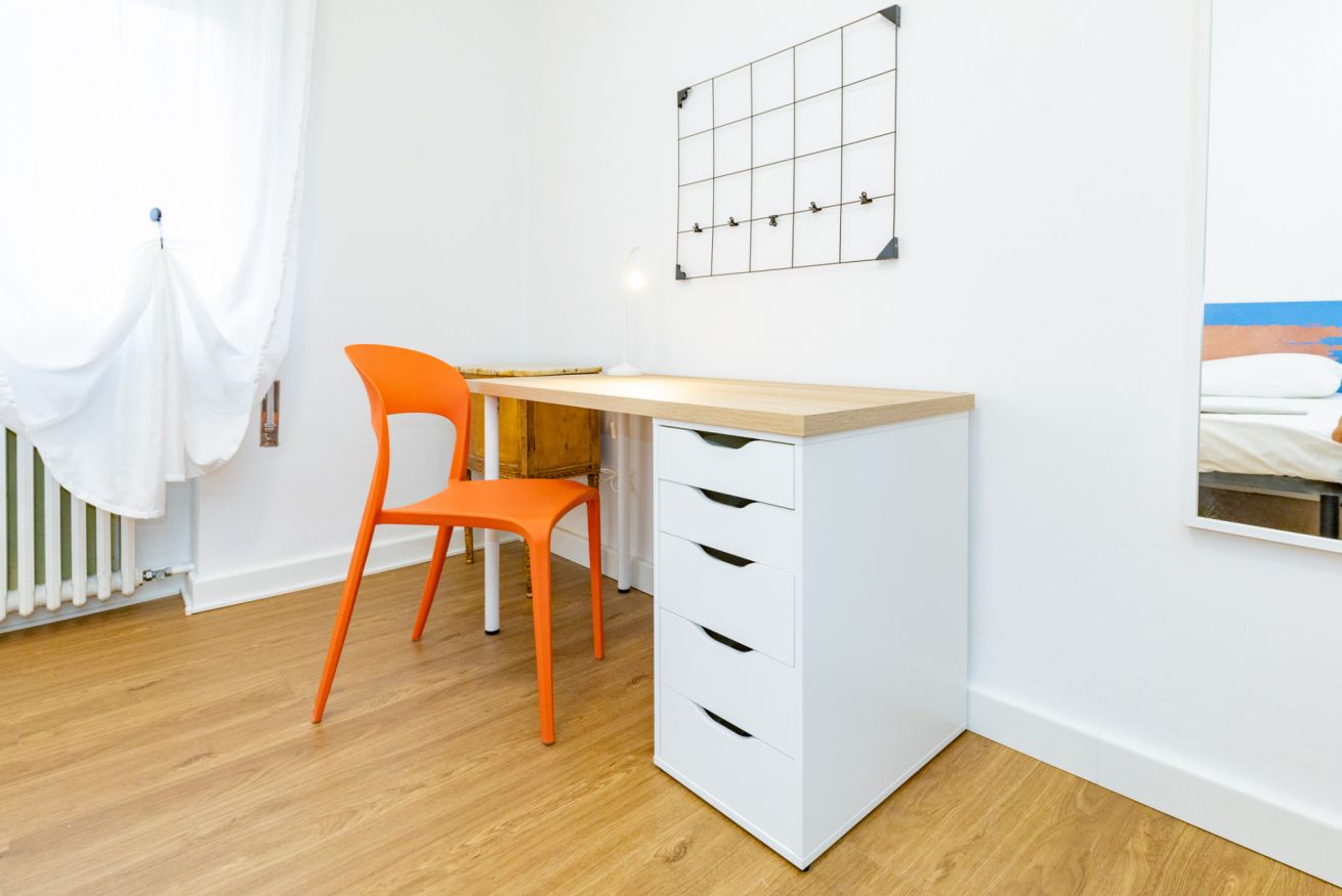 Camera Privata ad uso singolo con 2 letti accostati, comodini ed abajours, armadio doppio, comò, scrivania e lampada, specchio, attaccapanni, cestino e cesto portabiancheria. Inserita in alloggio con altre 3 camere private e con le seguenti aree condivise: ingresso, cucina e 1 bagno.
