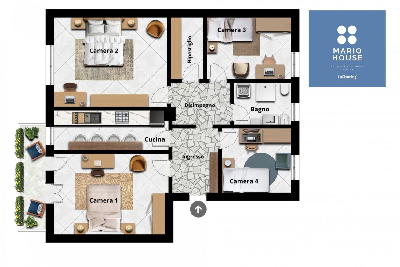 Camera Privata dotata di 2 letti singoli (uso singola) completi di materasso e guanciali, armadio, comodino, scrivania, sedia per lo studio e poltrona, inserita in alloggio con altre 3 camere private e con le seguenti aree condivise: ingresso, cucina, ripostiglio e 1 bagno.