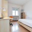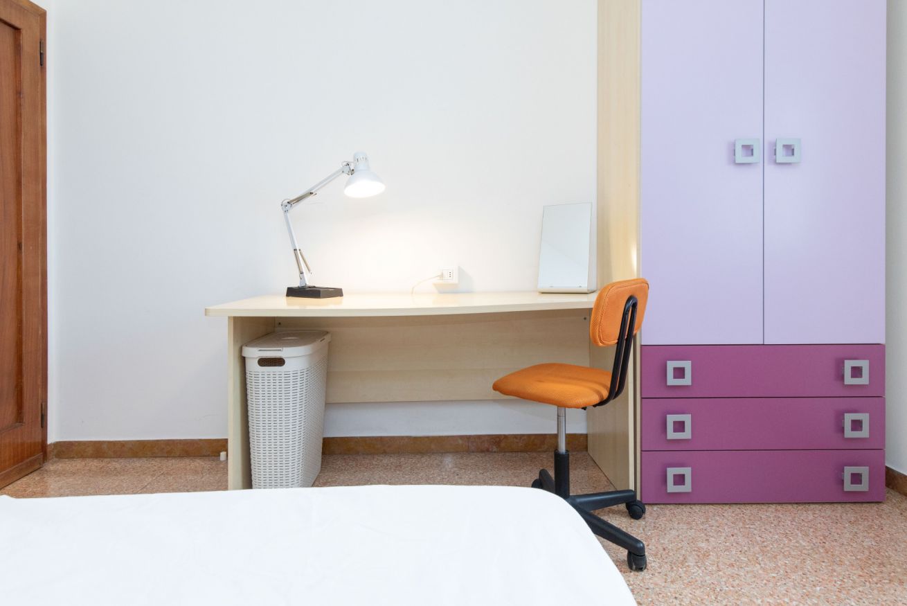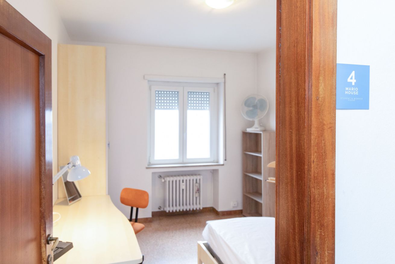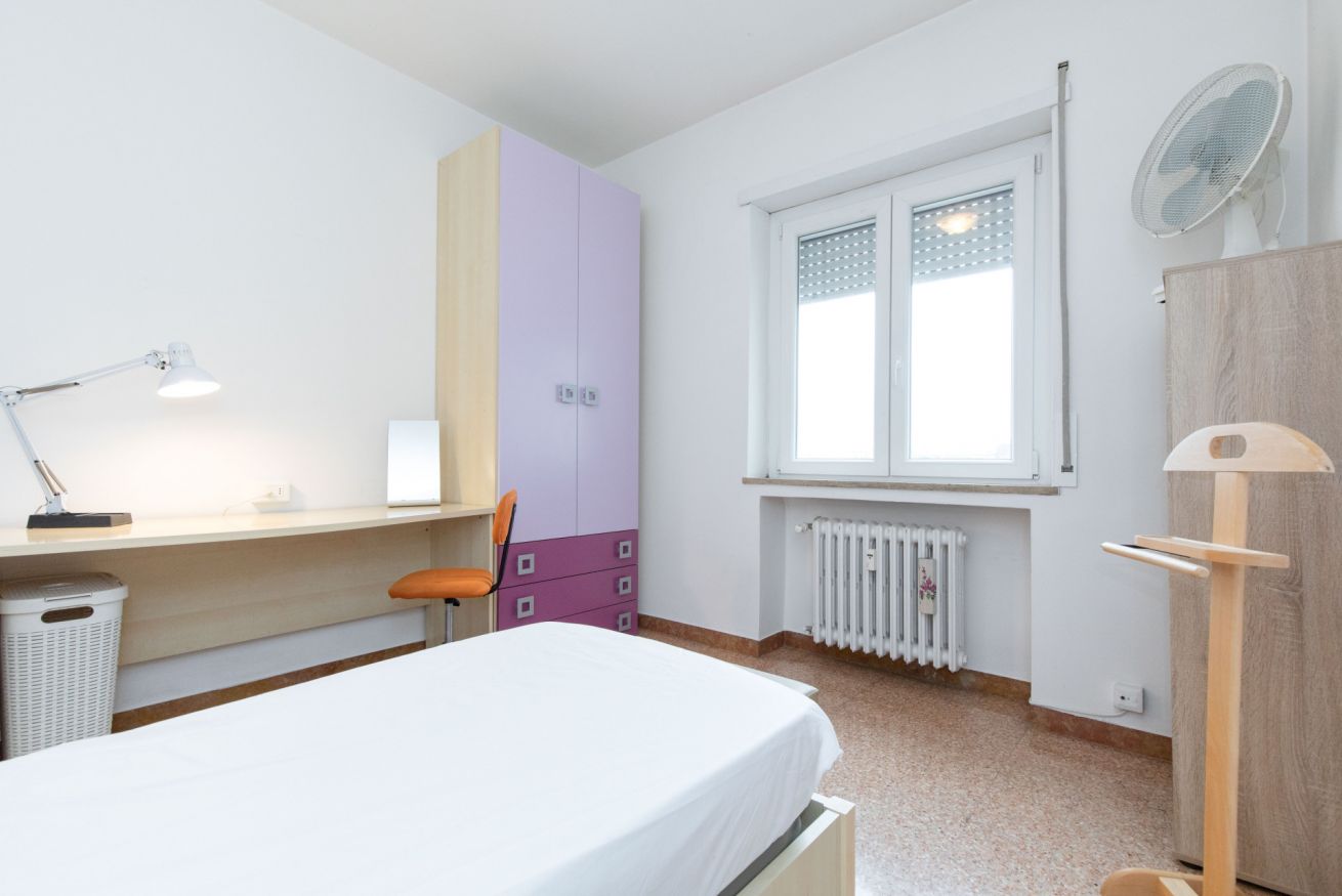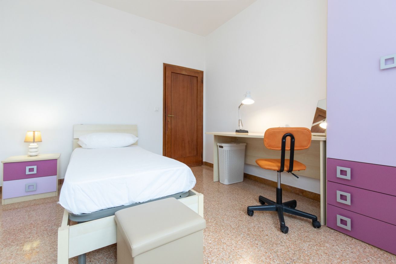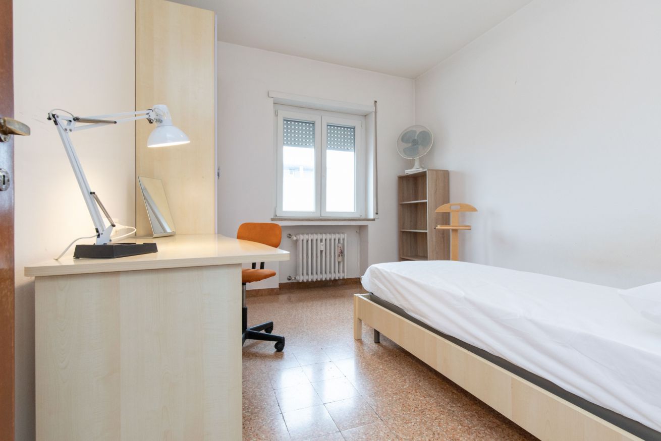 Camera Privata dotata di letto singolo (uso singola) completo di materasso e guanciali, armadio, comodino, scrivania, sedia per lo studio e poltrona, inserita in alloggio con altre 3 camere private e con le seguenti aree condivise: ingresso, cucina, ripostiglio e 1 bagno.