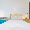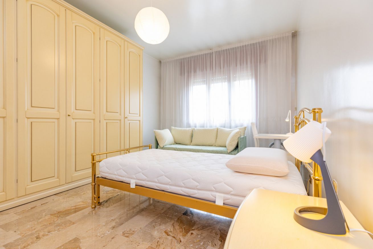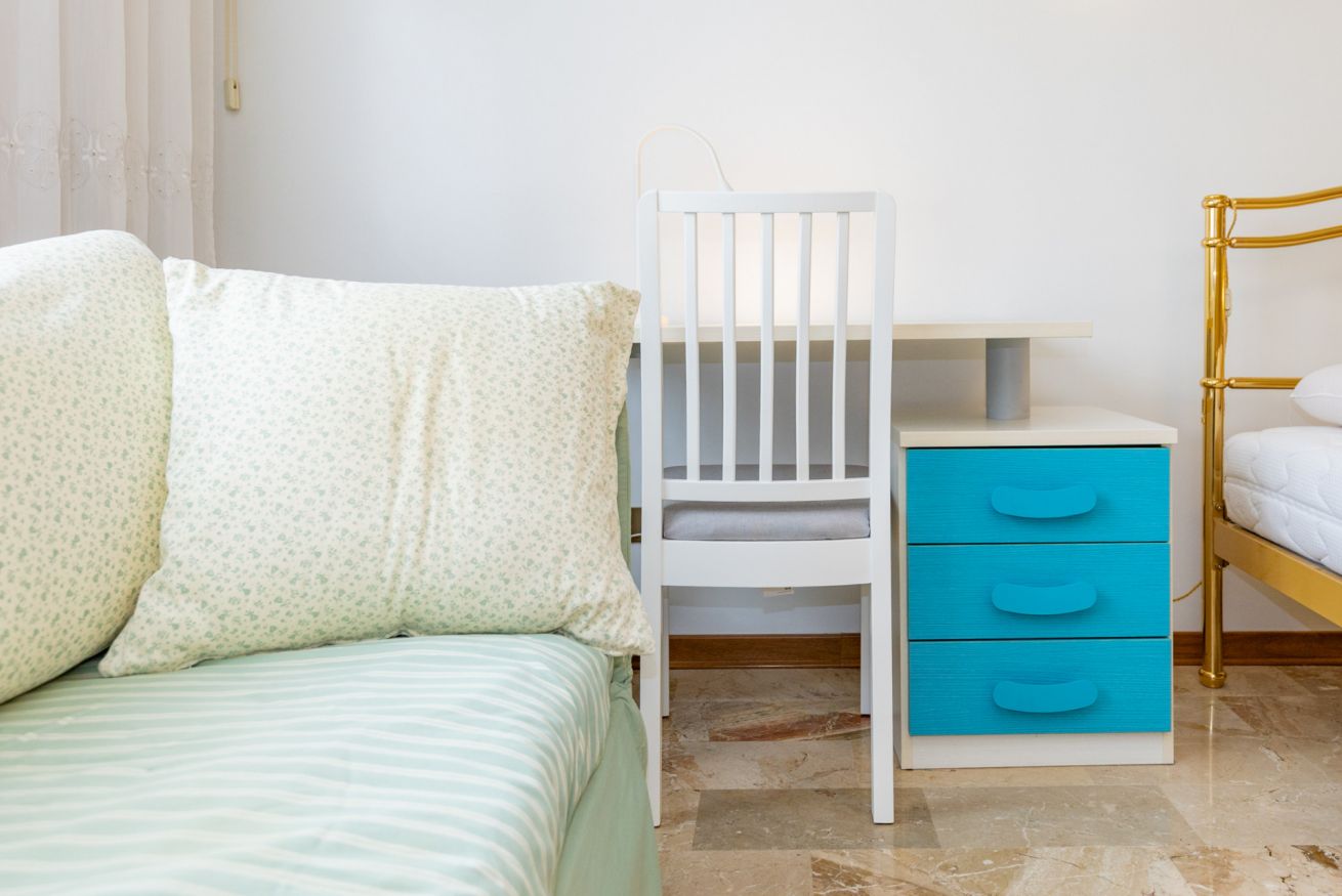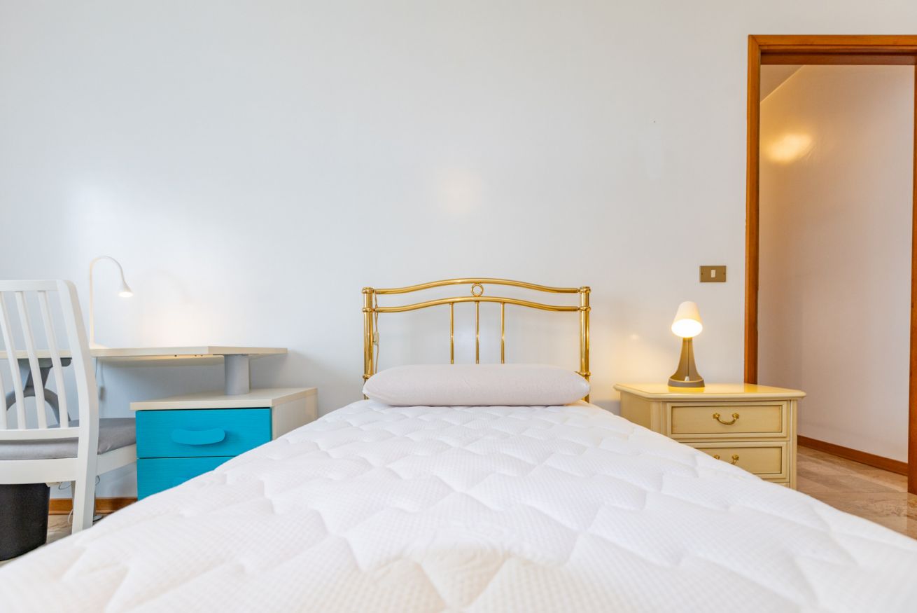 Camera privata ampia con letto singolo e divano letto, uso singolo, comodini e abajours, armadio doppio, comò, scrivania e lampada, sedia, specchio, attaccapanni, cestino e cesta portabiancheria. Inserita in alloggio con altre 2 camere private e con le seguenti aree condivise: ingresso, cucina e 1 bagno.