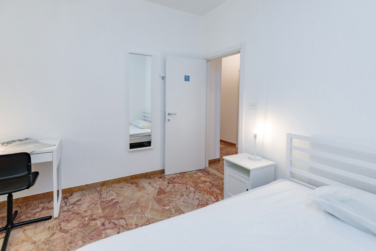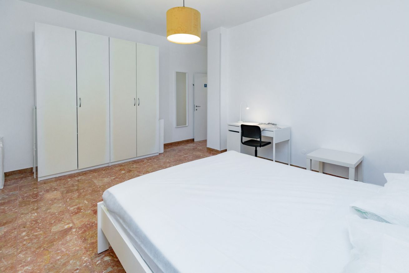 Camera ad uso singolo dotata di un letto matrimoniale, completo di materasso e guanciali, armadio, comodino, scrivania, libreria e sedia per lo studio. Inserita in appartamento moderno con 4 camere private e con le seguenti aree condivise: Ingresso, cucina, 2 bagni.