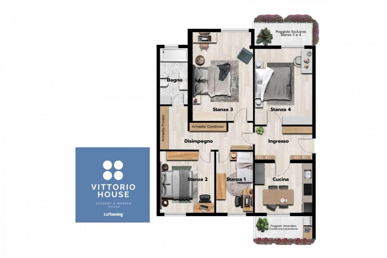 Camera Matrimoniale ad uso singolo con letto singolo, comodino, scrivania e sedia, armadio, poltrona, libreria, accesso al poggiolo condiviso con stanza 3 inserita in alloggio con 4 camere private e con le seguenti aree condivise: cucina con poggiolo verandato e 1 bagno.
